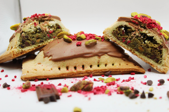 Ingredients: Flour, Confectioners Sugar, Pistachio Cream, Heavy Cream, Kataifi, Chocolate, Sugar, Butter, Cornstarch, Raspberries, Tahini, Cocoa Powder, Baking Soda, Baking Powder, Vanilla, Raspberry extract, Salt